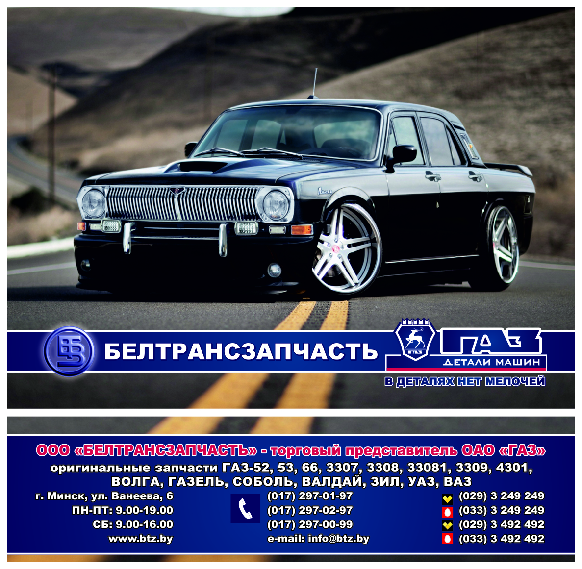 ООО “Белтрансзапчасть“ - основано в 1996 году. Специализируется на продаже запасных частей к грузовым автомобилям семейства ГАЗ, ЗИЛ, легковым автомобилям Волга, ВАЗ, НИВА, микроавтобусам Газель, Соболь, среднетоннажным автомобилям Валдай, легковым и грузовым автомобилям УАЗ, автобусам ПАЗ. Является торговым представителем ОАО ГАЗ на территории Республики Беларусь